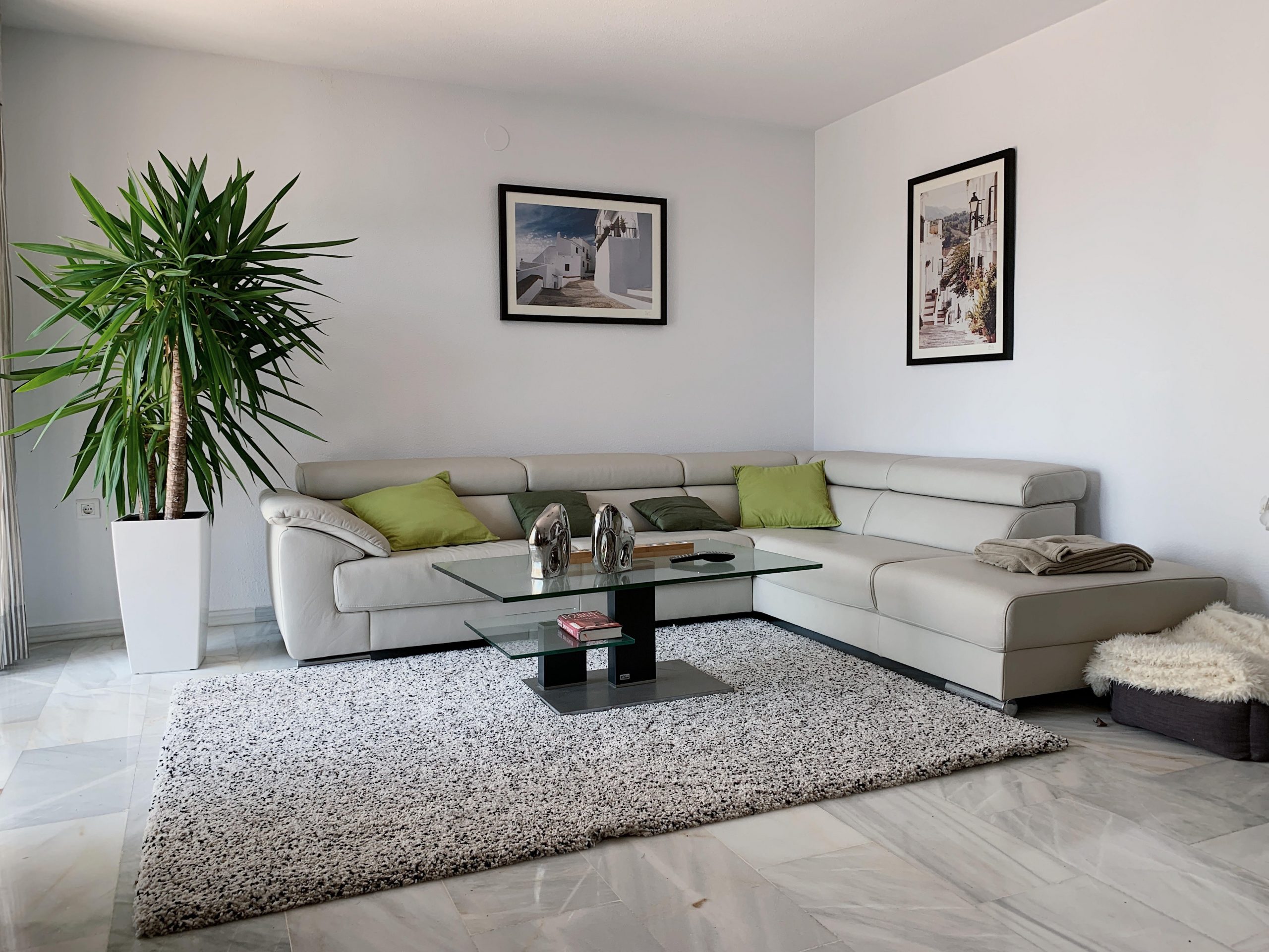 Durante la reunión con el cliente, la premisa quedó clara: menos es más. En efecto, dotamos a este salón de una estética minimalista con suelos de mármol veteado en gris y paredes blancas que, combinados con los muebles seleccionados por el cliente, aportan armonía al ambiente.